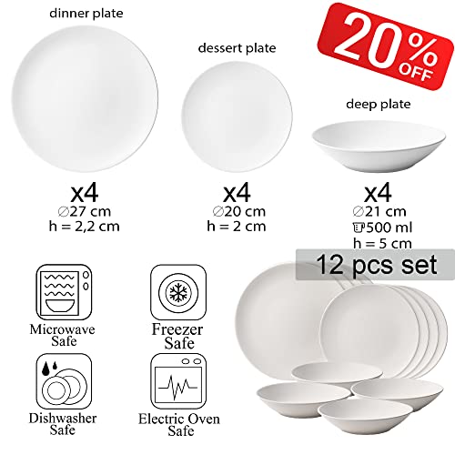 Cesiro servizio da tavola 12 pezzi. 4 x Piatto da cena/ piatto da dessert/ piatto fondo. Bianco opaco. lavastoviglie/forno elettrico/microonde/frigorifero/alimenti sicuri