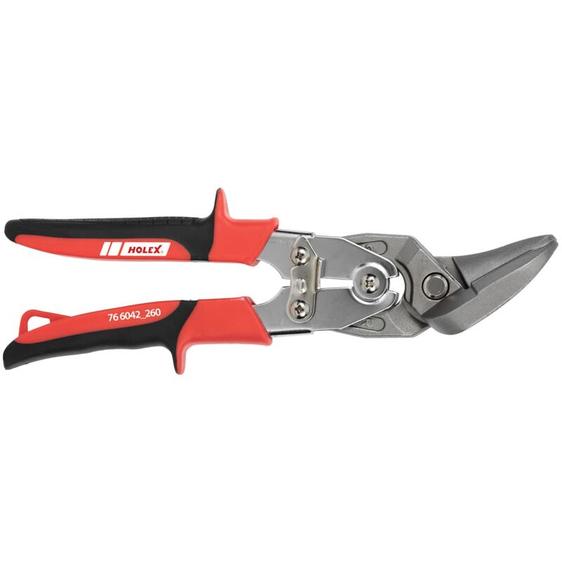 Testa della cesoia forgiata, taglienti temprati a induzione. Collegamento a vite regolabile, doppia trasmissione a leva e molla di apertura incorporata. Con microdentatura. Testa della cesoia in acciaio legato (HRC 58 − 60), manici in lamiera di acciaio, nichelati. Impugnatura bicomponente con inserto morbido antiscivolo. Capacità di taglio: Lamiere fino a 1,8 mm, lamiere V2A fino a 1,2 mm. Uso: Per tagli diritti continui e di forme. Dati tecnici Tipo di prodotto Cesoia Tipo di impiego destro Lunghezza complessiva, mm 260 Lunghezza taglienti, mm 33
