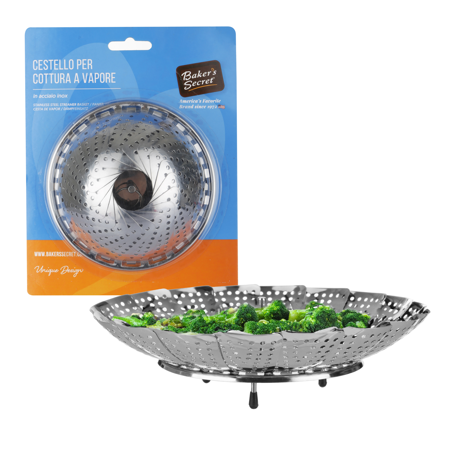 Il cestello in acciaio inox 18/0 della linea Baker's Secret è un accessorio indispensabile per chi predilige in cucina la cottura a vapore. Amica di un'alimentazione sana e di una dieta equilibrata, la cottura a vapore può essere effettuata sia con la pentola a pressione che con classiche pentole. Nel primo caso dovrai inserire il pratico cestello all'interno della pentola posizionando sopra le tue verdure da cuocere e sul fondo della pentola qualche dita d'acqua. Ma puoi usare questo versatile accessorio anche posizionandolo sopra padelle, casseruole e tegami sfruttando il calore generato dal piano cottura e ottimizzando i tempi gestendo due preparazioni in contemporanea. Il cestello ha diametro 13 cm ed è lavabile in lavastoviglie.