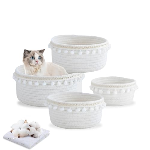 Cestini Intrecciati Corda di Cotone: HOMURY Set di 4 Cestini Portaoggetti, Impilabile Scatola di Immagazzinaggio con Decorazione a Frange per Armadio, Cosmetico, Bagno, Soggiorno (Bianco)