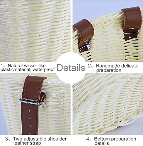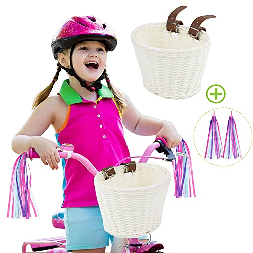 Cestino Bicicletta Bambina, Tessuto a Mano Ragazze Cestino Bicicletta Bimba con Cinghie di Cuoio Facile Installare Staccabile Bambino e Manubrio Stelle Filanti Streamers