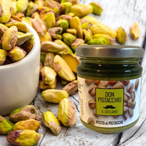 PESTO DI PISTACCHIO: Pesto innovativo realizzato con un trito di pistacchi invece del basilico, vasetto da 190gr. Con pistacchi di prima qualità ed è perfetto per qualsiasi tipo di pasta. È il condimento perfetto per condire la pasta fresca, specialmente se condita con pomodori secchi e gamberi. Si può gustare anche spalmato su croccanti crostoni di pane tostato da servire come stuzzicanti antipasti.