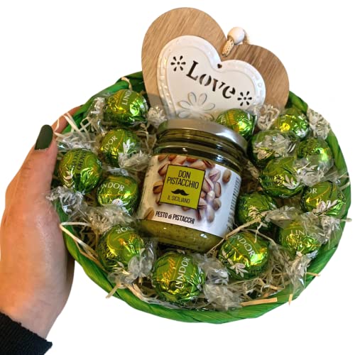 Ricevi: Idea Regalo Cesto in vimini col letto di paglia neutra contenente: 1 Vasetto Pesto di Pistacchio di Alta Qualità (190GR) + 200gr Lindt Lindor Pistacchio + Appendino sagomato a cuore con scritta Love in legno. Tutto confezionato in busta trasparente con chiusura a fiocco.