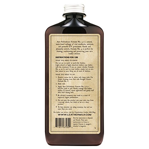 Chamberlain's Leather Milk - Balsamo e detergente per interni auto in pelle con protezione UV - Auto Refreshener No. 4 - naturale e atossico, protezione per interni auto Made in USA. 2 dimensioni. Spugnetta per il trattamento incluse nella confezione! - 0.35 L