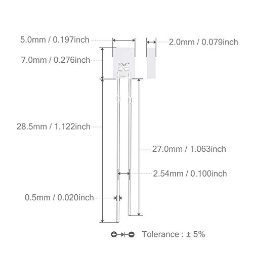 Parametri: 2 mm x 5 mm x 7 mm, DC 2V-2,2 V Volt 20 mA, Polarità (2 V): Anodo '+' (gamba più lunga) | Catodo '-' (gamba più corta), lente piatta rettangolare trasparente trasparente piccola