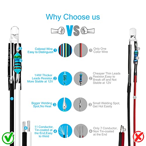 Cerchi un Diodo Led Abbastanza Luminoso Con Resistenza Corretta (±1% Tolleranza) Precablato? Fili di rame UL 24awg saldati a macchina (NESSUNA saldatura a mano) che NON si sfaldano facilmente, un sostituto perfetto per l'illuminazione del cruscotto e del controllo.