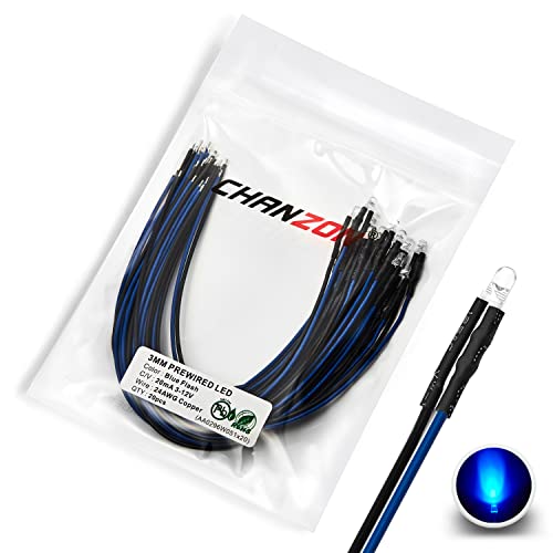Cavo UL - Chanzon 20 pezzi Pre Cablati 3mm LED blu lampeggianti luci a diodi (lente trasparente rotonda e trasparente DC 12V) con resistenza da 560 ohm 1/4W e indicatore di Cavo da 24AWG