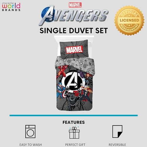 Character World Set copripiumino singolo per bambini Disney Marvel Avengers | Biancheria da letto reversibile su 2 lati con federa coordinata | Set di biancheria da letto singolo