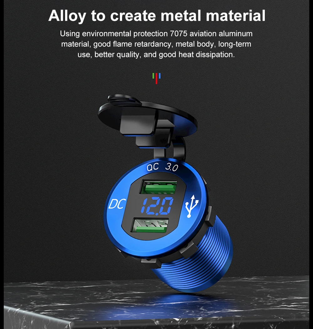 Dual USB car Charger Quick Charge 3.0 Waterproof Socket Aluminum Power Outlet Charge with LED Voltmeter for 12V 24V Car Boat