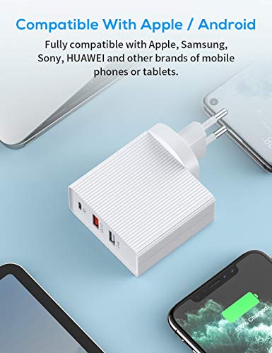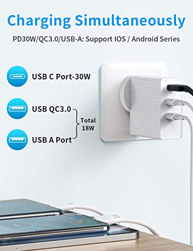 [Caricatore veloce USB C a 3 porte]: Questo caricabatterie è dotato di alimentatore USB C da 30W e di ricarica veloce USB da 18W e 5V 2.4A. È molto potente per ricaricare rapidamente dall'alimentatore USB massimo 48W attraverso tre porte. Ad esempio, se si desidera caricare tre smartphone o tablet contemporaneamente, chiedere: se si collegano le porte QC3.0 e 2.4A caricabatterie contemporaneamente, la potenza totale di uscita è di 18W.