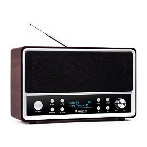 Auna Charleston - Radiosveglia digitale DAB+, design nostalgico (sintonizzatore FM, RDS, 2 sveglie, timer di sonno, snooze, data e ora, in legno, colore marrone scuro