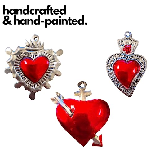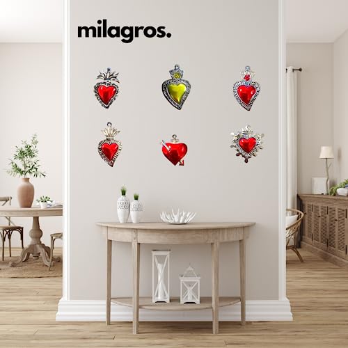 Charm a forma di cuori messicani Milagros in latta dipinta a mano in Messico Decorazione da parete in metallo Folk Art 14 cm (Set di 6) Rojos, 2.5 inches, Stagno