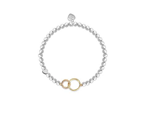 Grazioso braccialetto con ciondoli a cerchio placcati in oro e argento su un braccialetto elastico con perline da 5 mm. Il braccialetto viene presentato in una lussuosa confezione regalo, con un biglietto #BestMumEver 'The Love Between A Mother & Daughter Is Forever'. Tutti i gioielli sono rifiniti secondo i più alti standard e rivestiti in E, per evitare l'ossidazione.