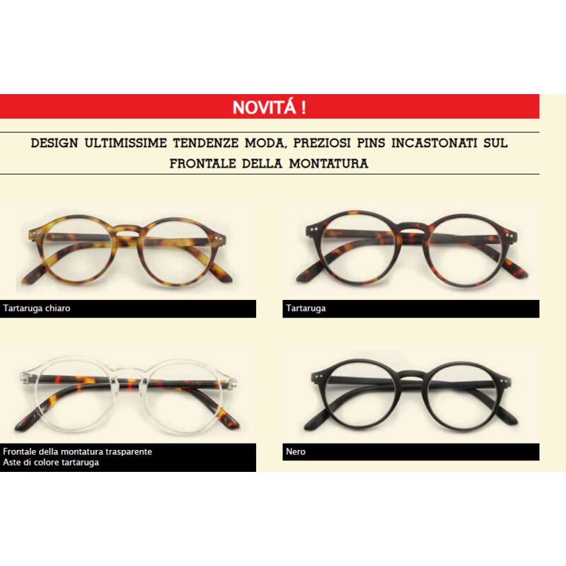 Riferimento: ECALASKA El Charro "Alaska" - Occhiali Da Lettura Gli occhiali per presbiopia Alaska di El Charro presentano una forma classica tondeggiante... alla John Lennon! Oltre ai classici nero opaco e tartaruga scuro, abbiamo realizzato una colorazione tartaruga chiara e una particolare versione all'ultima moda con frontale trasparente e aste tartarugate. > Occhiali da lettura con montatura in leggerissimo materiale organico iniettato > Design tondeggiante con preziosi pins in metallo sul frontale > Aste flessibili, cerniere con meccanismo a molla per la migliore adattabilità al viso > Lenti asferiche, sottili ed infrangibili, con trattamento antigraffio e antiriflesso > Elegante confezione regalo > Qualità certificata da Certottica, l'Istituto Italiano per la Certificazione dei Prodotti Ottici Misure: - Calibro: 47,7 mm - Ponte: 21 mm - Lunghezza Aste: 140 mm