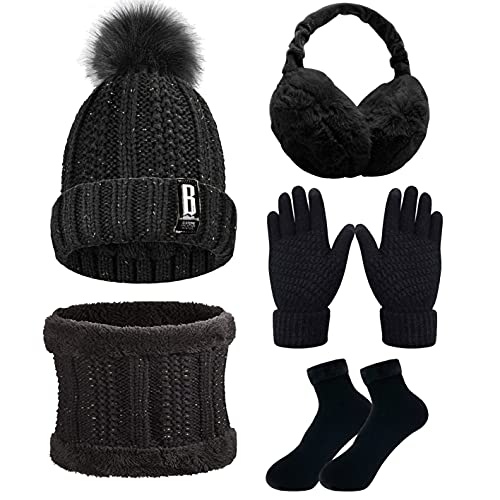 CheChury Donna Cappello Sciarpa e Guanti Touch Screen Invernali Berretto in Maglia Fodera in Pile Sciarpa Beanie con Pompom Caldo Berretti Sciarpa Regalo di Natale (Nero-5 Set)