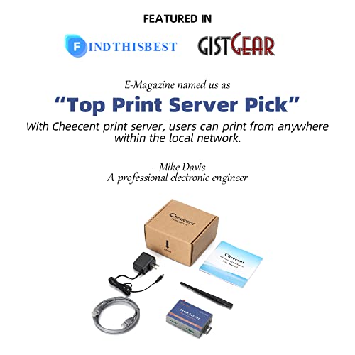 Leggere prima dell'acquisto: il server di stampa CHEECENT per stampante USB è progettato per sostituire l'host della stampante, richiede impostazioni di rete e sistema del computer, non Plug and Play. Segui il video su questo elenco "Video" e "Domande e risposte dei clienti". Leggere l'elenco di compatibilità della stampante, manuale utente nella "Guida al prodotto e documenti" prima dell'acquisto. Gestione basata su browser, supporto DHCP e IP automatico, istruzioni di installazione chiare e accessori completi, ti aiutano a configurarlo senza software aggiuntivo.