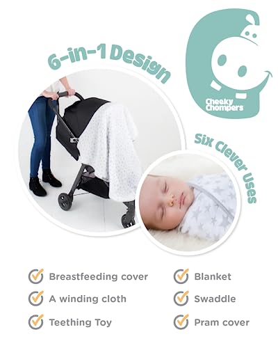 Cheeky Chompers Copertina per bambini di mussola multiuso - Versatile, per avvolgere neonati, per il ruttino, copertina e copertura per passeggino (Silver Stars)