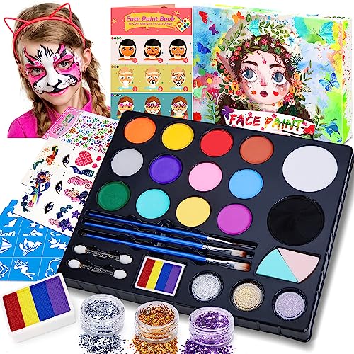 Chennyfun Colori Trucco Viso Bambini, 16 Colori Body Paint Tavolozza con Disegni Libro di Insegnamento, Split Cake Face Paint, 3 Glitter, 3 Pennelli - Kit Halloween Trucco Carnevale Pasquale