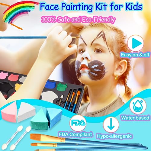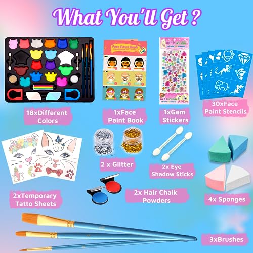 ★【Set di Trucco per Bambini Unicorni Perfetti】 Il nostro kit di trucco per bambini unicorni è stato appositamente progettato per bambini e adulti. Ci sono 18 colori colorati per il viso e il corpo, vari stencil riutilizzabili e 3 pennelli artistici professionali in un'unica tavolozza per farti sperimentare il divertimento del trucco. dipingi come vuoi.