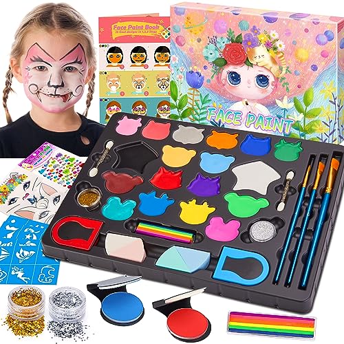 Chennyfun Colori Trucco Viso Bambini, 18 Colori Body Paint Tavolozza con Disegni Libro di Insegnamento, Split Cake Face Paint, 2 Glitter, 3 Pennelli - Kit Halloween Trucco Carnevale Pasquale