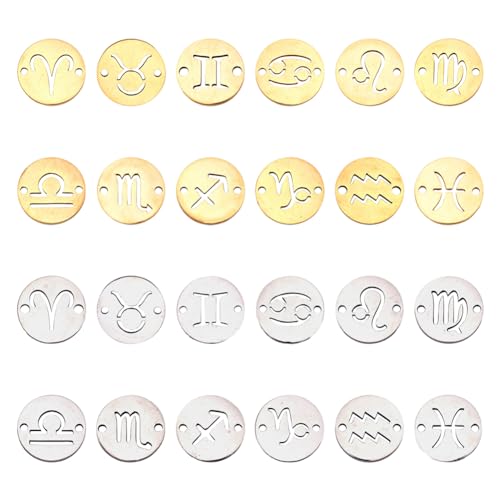 Cheriswely, 24 ciondoli piatti e rotondi a forma di segno zodiacale in acciaio al titanio, 12 giunti per gioielli fai da te e artigianato, foro: 0,8 mm