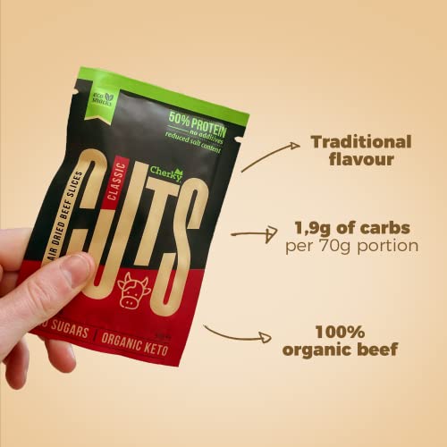 Cherky ECO Biltong BIO Cuts Classic, 10 x 30 g - Tagli di carne secca BIO Biltong, manzo spagnolo BIO alimentato a erba, essiccato all'aria, chetogenico, senza additivi, non OGM, certificato BIO