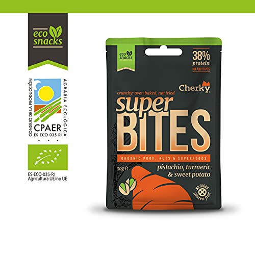 SENZA ADDITIVI - CON CARNE DI MAIALE 100% BIOLOGICA: come tutti i nostri prodotti Cherky, i nostri Superbites ECO non contengono additivi artificiali, conservanti, coloranti o zuccheri aggiunti. I nostri ingredienti e spezie, così come i pezzi di maiale selezionati a mano, provengono da agricoltura biologica. I valori nutrizionali dei nostri ECO Superbites sono assolutamente al top: oltre il 35% di proteine, quasi nessun carboidrato e pochi grassi.