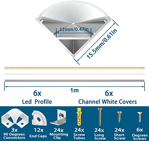 Questa confezione da 6 pezzi (ogni elemento misura 1 m. Il profilo LED a forma di V viene fornito oltre ai 5 profili con tutti gli accessori di montaggio: 6 coperture bianche lattiginose, 12 tappi terminali, 22 viti (lunghe), 22 viti (corte), 22 tappi gialli e 22 clip di montaggio per i profili stessi. Se si tratta di un connettore angolare a 90 gradi, si prega di cercare direttamente ASIN: B08DJZKJKQ, Grazie!