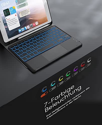 CHESONA Custodia per iPad 9 generazione, con tastiera, iPad 10.2, tastiera 9/8/7a generazione, con touchpad, illuminazione a 7 colori, 2 canali BT, tastiera QWERTZ rimovibile per iPad 10.2, nero