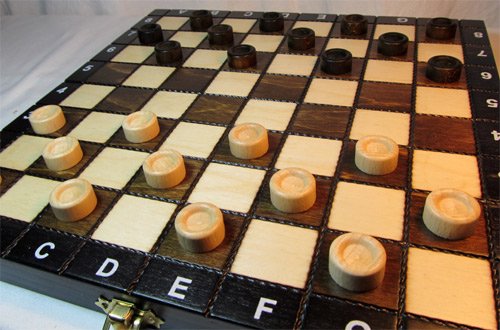 La scatola di legno aperta serve come campo da scacchi, backgammon e dama