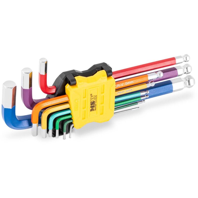 Chiave a brugola - 9 pezzi di MSW Con il set di chiavi angolari ACC-LKH1 di MSW hai una presa salda su ogni vite esagonale. La selezione di diverse chiavi esagonali offre la soluzione perfetta per le viti più comuni! Questo pratico set di chiavi angolari include ben nove chiavi esagonali, per permetterti di avere sempre la grandezza giusta a portata di mano e poter quindi applicare la coppia di serraggio ottimale alla vite utilizzata. Nei lavori più duri, le chiavi angolari in acciaio legato e temperato convincono con la loro elevata stabilità. In questo modo avrai sempre lo strumento giusto per stringere o allentare la maggior parte delle viti. Le chiavi esagonali nelle grandezze da 1,5 a 10 mm convincono con una trasmissione ottimale della forza e con una coppia di serraggio elevata. Grazie alla struttura a testa sferica, è possibile eseguire anche lavori di avvitamento difficili con angoli fino a 25°. Lavorare sarà una passeggiata, grazie all'ordinato supporto in plastica dotato di