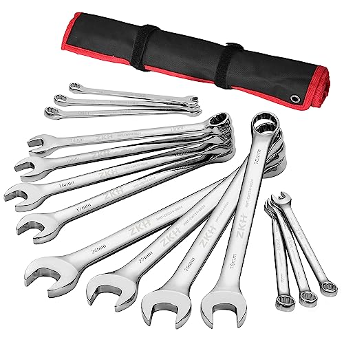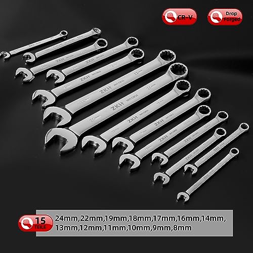 ZKH Chiave combinata doppia con cricchetto, 14 pezzi, con custodia, 8-24 mm, acciaio al cromo vanadio, resistente allo sporco, alla ruggine e all'usura, strumenti meccanici per auto, edilizia