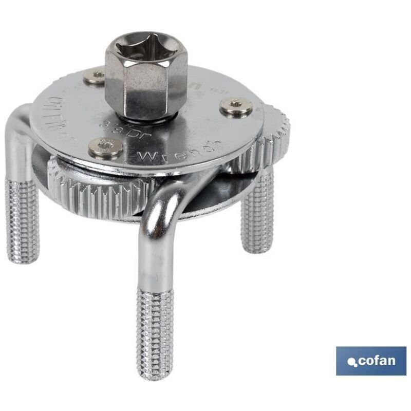 Chiave per filtri autoregolante a tre gambe curve, realizzata in acciaio al cromo vanadio con misure da Ø65 a Ø110 mm. Chiave a ragno per filtro olio. Attacco con quadro maschio da 3/8 pollici o SW 21. Questa chiave a tre griffe può essere regolata in