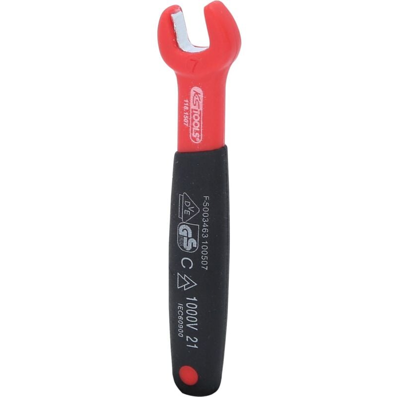 Chiave a forchetta isolata, 7 mm Larghezza tra le piastre in mm 7 Standard DIN 7446, IEC 60900 Peso del tessuto 19 Dimensioni dell'imballaggio 1 Isolamento Tauchisolierung nach DIN EN 60900 Materiale1 Feinster Chrom Vanadium Stahl