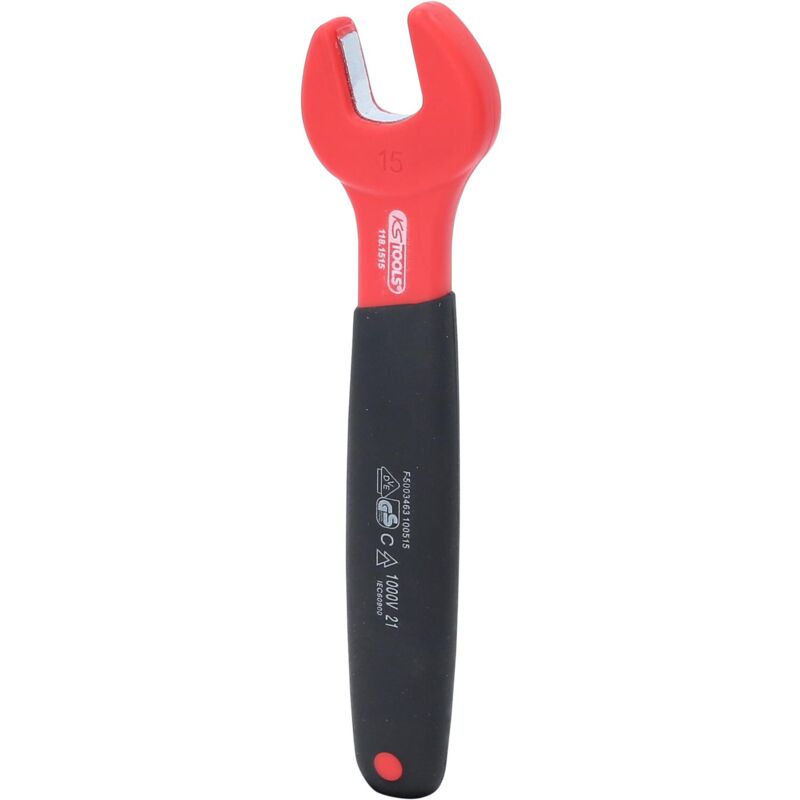Chiave a forchetta isolata, 15 mm Larghezza tra le piastre in mm 15 Standard DIN 7446, IEC 60900 Peso del tessuto 122 Dimensioni dell'imballaggio 1 Isolamento Tauchisolierung nach DIN EN 60900 Materiale1 Feinster Chrom Vanadium Stahl
