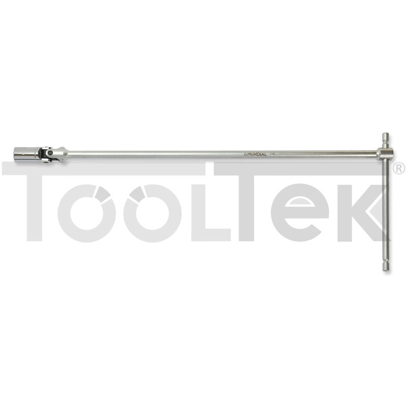 Chiave a “T” snodata lunga MUNDIAL CARATTERISTICHE: Snodo cardanico Asta di manovra scorrevole ed estraibile Corpo in acciaio cromo vanadioFinitura cromataMisura: 13 mm esagonale Lunghezza: 460 mm Prodotto di qualità