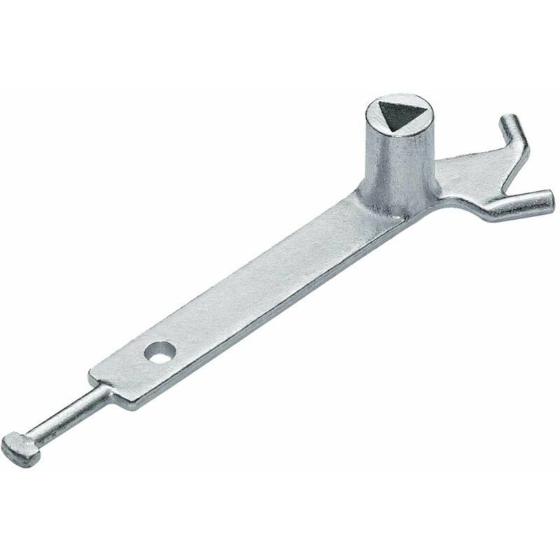 Prodotto secondo la norma DIN 3223 in acciaio fuso il gancio anteriore serve per aprire le chiusure di sicurezza dei pali, il pezzo a T all'estremità per sbloccare i tappi di copertura