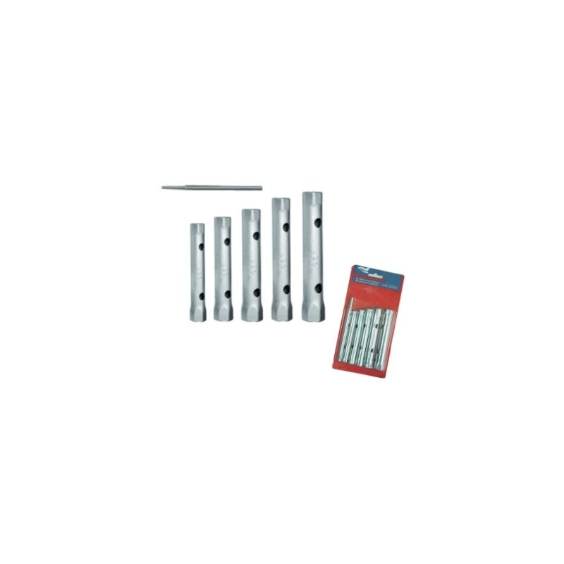 Chiavi a tubo in acciaio satinato 5 pezzi e leva/perno. Fornite in blister.