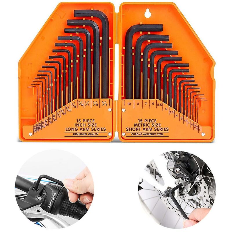 Acciaio trattato termicamente con finitura brunita, contiene 15 chiavi a lunga portata e 15 chiavi corte a leva alta. L'estremità di azionamento convenzionale sia sulle chiavi lunghe che corte, consente un'elevata leva su fissaggi ostinati. Dimensioni ad alta visibilità contrassegnate su ciascuna chiave inglese e robusta custodia per il trasporto per una rapida selezione delle dimensioni e una facile organizzazione. Questo set di chiavi a brugola da 30 pezzi copre completamente tutte le viti a esagono incassato e contiene misure sia in pollici che metriche.