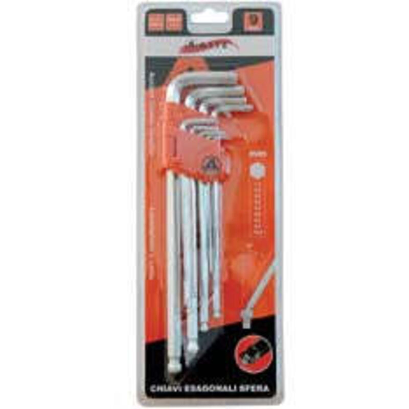 Serie 9 chiavi esagonali piegate lunghe Acciaio Cromo Vanadio - Supporto plastica Testa sferica Ball Point inclinabile 30^ Composizione: 1,5-2-2,5-3-4-5-6-8-10