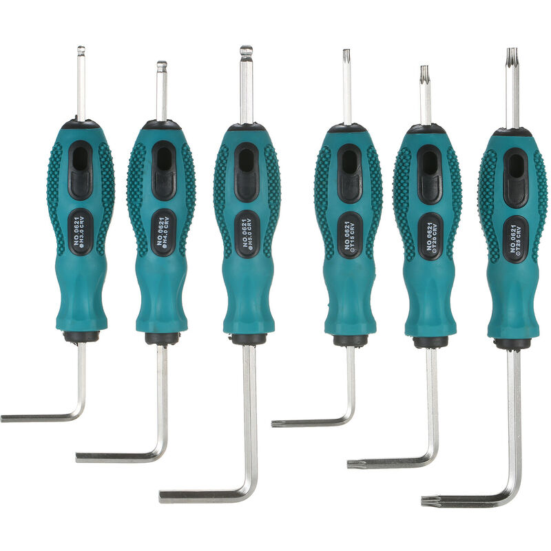 Specifica: Colore: verde + Nastro Materiale: acciaio al cromo vanadio Durezza: 52-54HRC Quantità chiave a brugola: 6 pezzi Estremità sferica Chiave esagonale metrica: H3.0 H4.0 H5.0 Chiave Torx: T15 T20 T25 Lunghezza totale: 132 mm, 152 mm, 173 mm Lista di imballaggio: 3 * chiave esagonale con estremità sferica 3 * chiave Torx