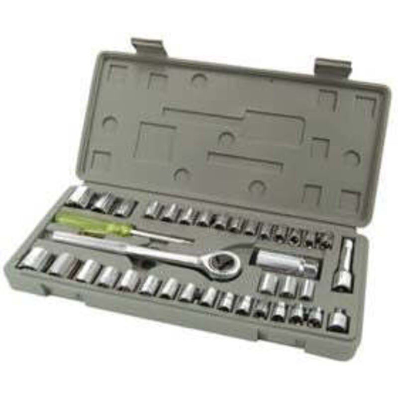 Assortimento 40 pezzi valigetta plastica Acciaio al carbonio Composizione: 12 bussole 1/4 mm 4/13, 12 bussole 1/4 5/32-1/2 3 bussole 3/8 mm 14/17, 3 bussole 3/8 9/16-3/4 1 cricchetto, 1 prolunga, 1 impugnatura, 1 ghiera