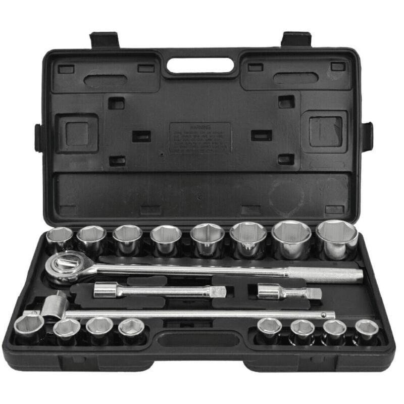 Realizzato in resistente acciaio CV, lucidato e cromato Meccanismo a cricchetto a cricchetto con 24 denti Progettato per il lavoro in officina Tutto in una valigia di plastica Il set contiene: 16 bussole da 3/4: 19, 21, 22, 23, 24, 26, 27, 29, 30, 32, 35, 36, 38, 41, 46, 50 mm 3 prolunghe da 3/4: 100, 200, 400 mm Cricchetto 3/4: 495 mm Pomello con perno tipo T 3/4: 600 mm Peso: 12,5kg