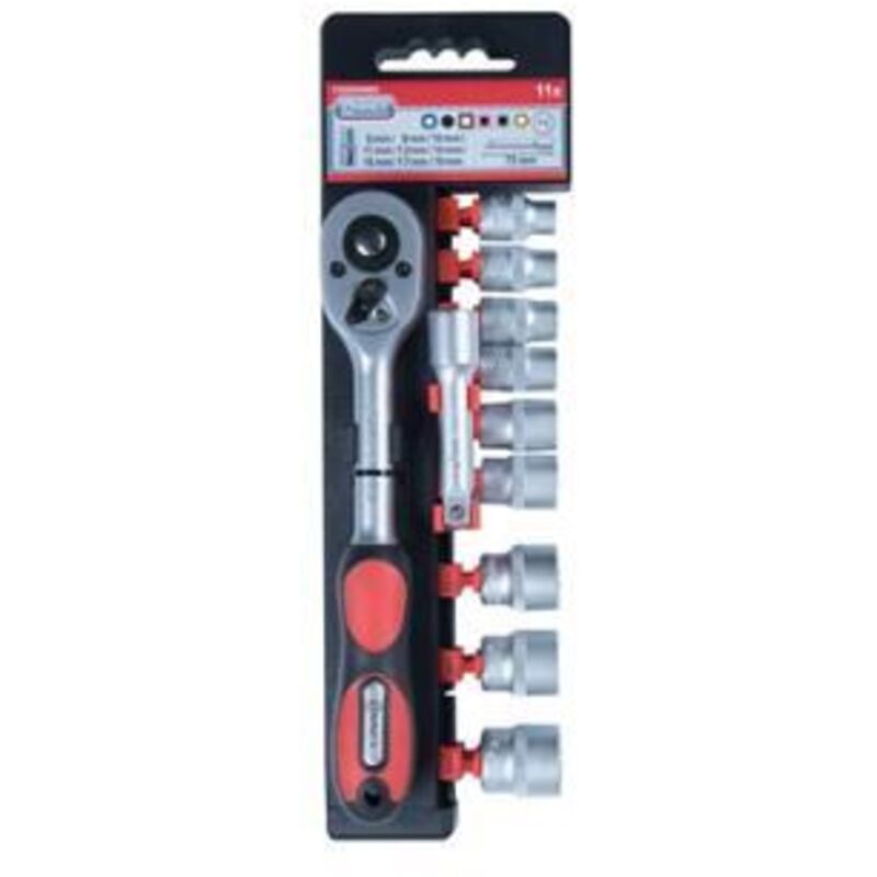 Set bussole con cricchetto 3/8 11 pz Masidef Set bussole con cricchetto 3/8 11 pz Caratteristiche: set composto da 11 pz.: cricchetto da 3/8 a 72 denti, manico in bimateriale prolunga da 75 mm 9 bussole alta qualità in acciaio cromo vanadio Misure: 8 - 9 - 10 - 11 - 13 - 14 - 16 - 17 - 19 mm protezione antifurto per tutti i componenti
