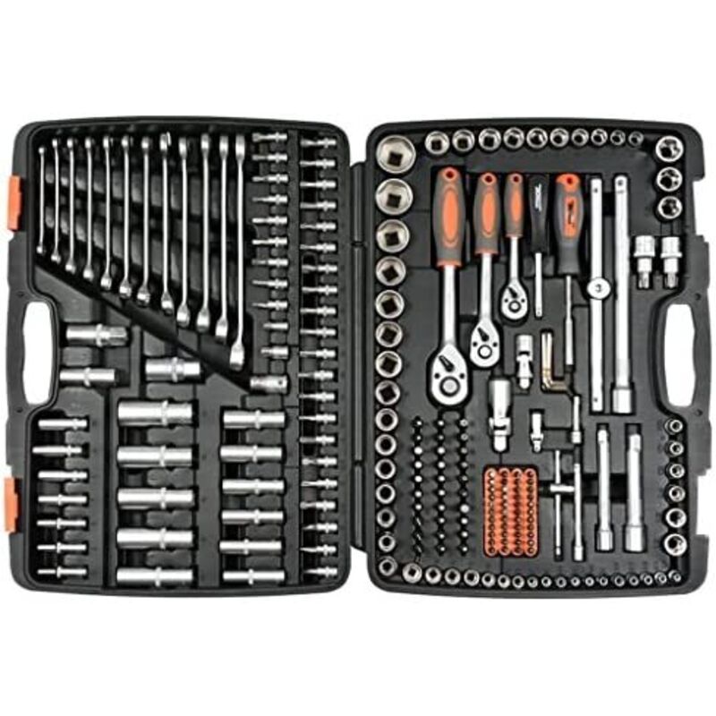 Questo set Sthor di attrezzi comprensivo di 216 pezzi, che include bussole e punte di diversa misura, è completo, durevole e adatto all'uso quotidiano in garage o in officina. E' il kit perfetto per tutti gli amanti del fai da te, meccanici e hobbisti. Il cricchetto reversibile è l'ideale per isvitare e avvitare i bulloni in luoghi difficili da raggiungere. Il pulsante di sgancio rapido permette un rapido cambio. La leva a interruttore sul retro della testa permette di cambiare la direzione in modo rapido ed efficiente. La morbida impugnatura gommata è comoda da tenere e utilizzare Tutti gli attrezzi, chiavi e punte hanno indicata la propria misura per una facile identificazione. Questo set è facile da trasportare grazie ai suoi pezzi ordinatamente riposti in una valigetta. Specificazioni: Materiale: Metallo resistente La consegna include: 1/2": 1 x Chiave a bussola a cricchetto 15 x Bussole: 10/11/12/13/14/15/17/19/20/21/22/24/27/30/32 mm 5 x Bussole lunghe: 16/17/18/19/22 mm 3 x