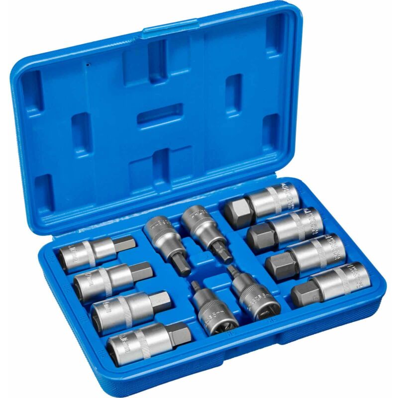 SET CHIAVI A BUSSOLA 12 PZ ESAGONALI ESAGONO 1/2 MASCHIO BUSSOLE METRICHE Con questo pratico set di chiavi a bussola, siete equipaggiati al meglio per ogni tipo di lavoro. Il set di chiavi dalla perfetta adattabilità sostituisce una molteplicità di cacciaviti giraviti convenzionali. L'assortimento di 12 pezzi è realizzato in resistente acciaio al cromo-vanadio temprato e consente, pertanto, un lavoro davvero preciso. Il set completo è ordinatamente disposto in una robusta valigetta, in modo da avere sempre gli inserti giusti a portata di mano. Ideale per appassionati del fai da te e professionisti. CARATTERISTICHE: Set da 12 pezzi Set di chiavi a bussola d'alta qualità in acciaio al cromo-vanadio Tutte le chiavi a bussola con zigrinatura e sede per bloccaggio a sfera Resistente e robusto Disposizione chiara e ordinata Perfetto per lavori di precisione Robusta valigetta DATI TECNICI 12 chiavi a bussola esagono cavo ½” (H5, H6, H7, H8, H10, H12, H14, H16, H17, H18, H19, H22) Materiale
