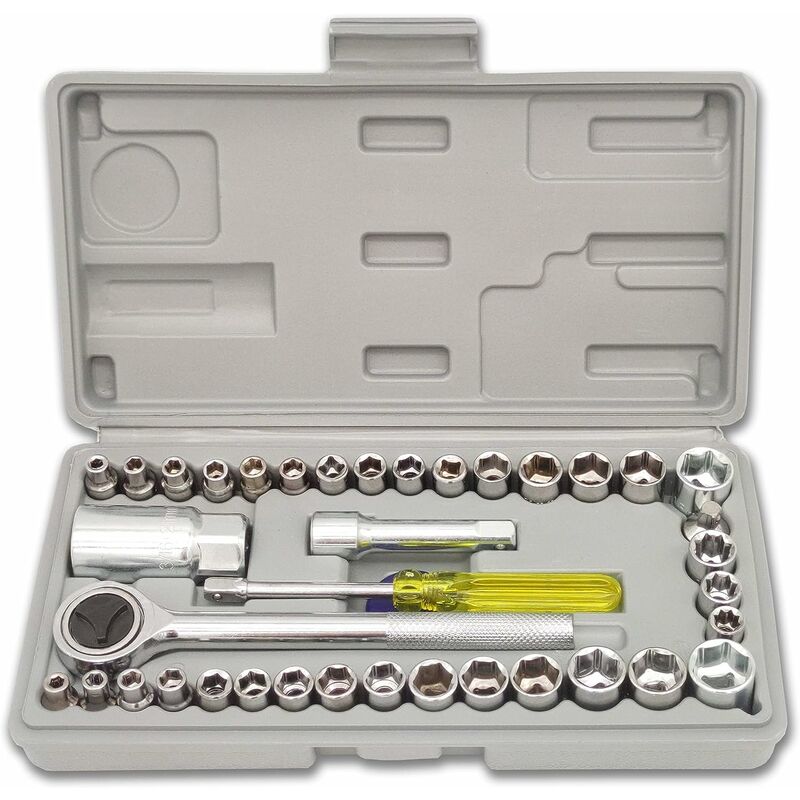 Finitura cromata anticorrosione - Tutti gli strumenti sono completamente lucidati e trattati termicamente con tripla finitura cromata, che può proteggere gli strumenti dalla corrosione. Non c'è bisogno di preoccuparsi di lasciare gli strumenti da soli. all'aperto o sotto la pioggia, poiché i nostri strumenti sono antiruggine. [Set di attrezzi da 40 pezzi] Il set di attrezzi è dotato di di tutti gli strumenti più necessari e necessari di cui tutti hanno bisogno nella vita quotidiana. Compresi kit di prese, chiavi cricchetto, cacciaviti, ecc. [Conservazione sempre stabile] Gli strumenti sono imballati in una robusta scatola di plastica e ognuno è in ordine, quindi non c'è nulla di sciolto. Dimensioni: 24,2 x 12,2 x 3,7 cm (lunghezza x larghezza x altezza). Peso: 1 kg. [Applicabile a;