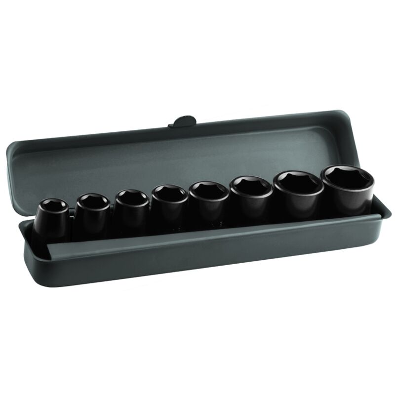 Versione in cromo vanadio Extra rinforzato per utensili pneumatici Dati tecnici Numero di prese 8 pezzi. Dimensioni delle prese 8, 10, 11, 12, 13, 14, 17, 19