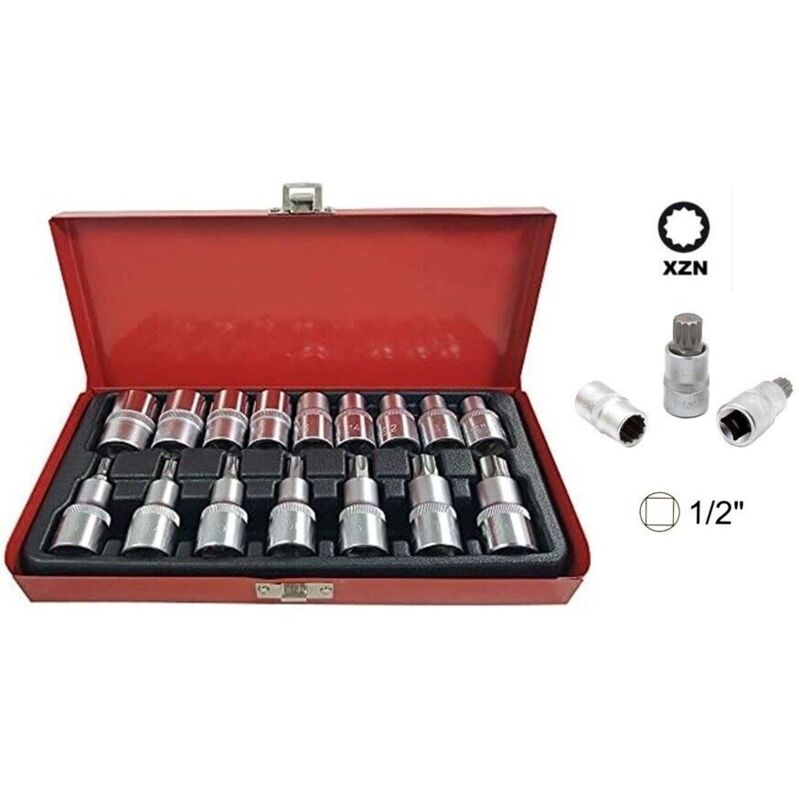 Set di bussole da 1/2 maschio-femmina con profilo xzn passo m13 pezzi.set di bussole maschio e femmina multirighe con attacco da 1/2.realizzate in acciaio al chrome vanadium, materiale di gran lunga piu' resistente del normale acciaio.il set si compone di:7 bussole maschio con attacco da 1/2 e profilo xzn a passo m di misura:m6--m8--m9--m10--m12--m14--m16 6 bussole femmina con attacco da 1/2 e profilo xzn a passo m di misura:m8--m9--m10--m12--m14--m16 il tutto in valigetta di metallo.
