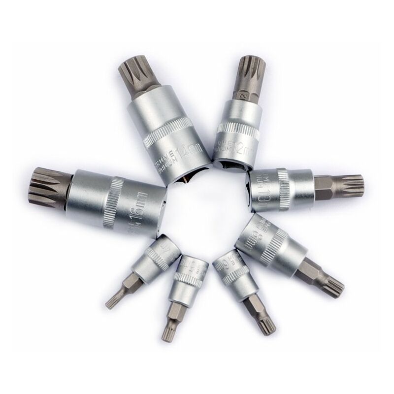 Set chiavi a bussola multidente: M4 M5 M6 M8 M10 M12 M14 M16 Punte multidente 8 pezzi. set di chiavi a bussola denti interni ordinati su guida per chiavi a bussola Attacco da 1/4": Attacco M4 / M5 / M6 3/8": Attacco M8 / M10 / M12 1/2": M14 / M16 Altezza chiave a tubo M6 / M5 / M4 = 40 mm M12 / M10 / M8 = 47 mm M16 / M14 = 56 mm acciaio cromo vanadio cromo opaco< /p>